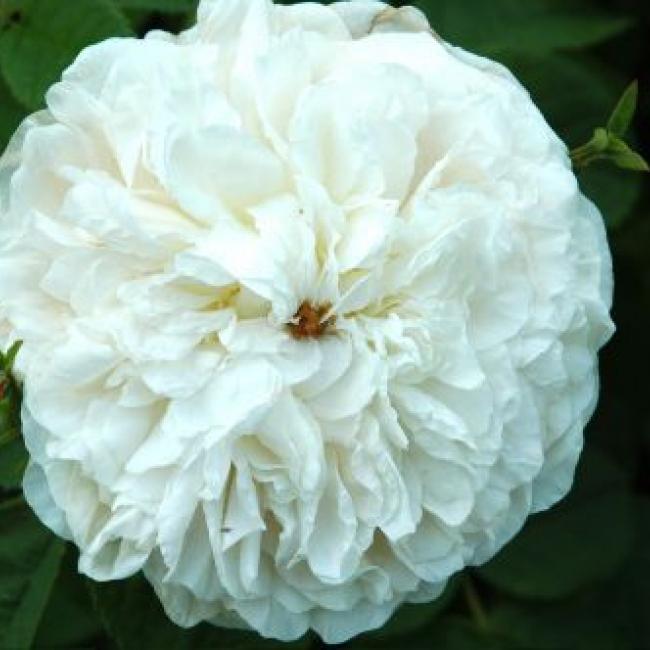 Plantier 1835 Aus die sanft rosa farbigen Knöpfen kommen Creme-weiße Blüten mit manchmal einen grünen Punkt im Herzen. Die Blüten sind mittelgroß, halb gefüllt und stark duftend. Die Rose blüht in Dolden zwischen Anfang Juni bis Ende Juli. Das Laub ist schmal, verzweigt, stark verbogen und hat fast keine Stacheln. Geeignet als ein Einzelgänger oder als eine Kletter-Rose.